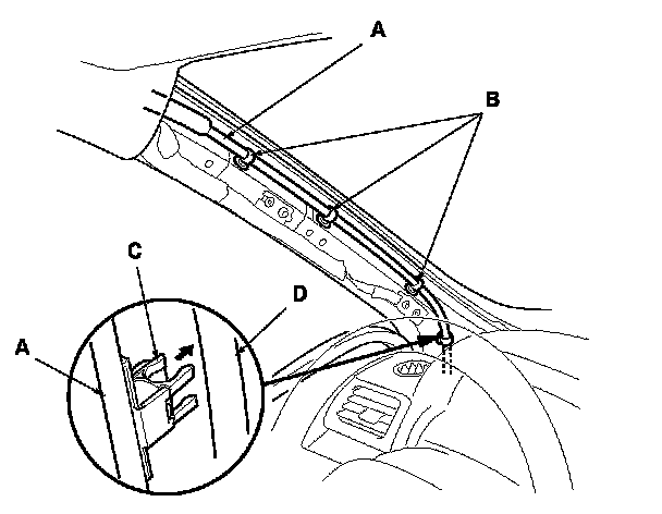 10. Remove the roof wire harness (A) by detaching the harness clips (B) from the driver's side A-pillar, and release the lowest clip (C) with a tube holder from the front moonroof drain tube (D).