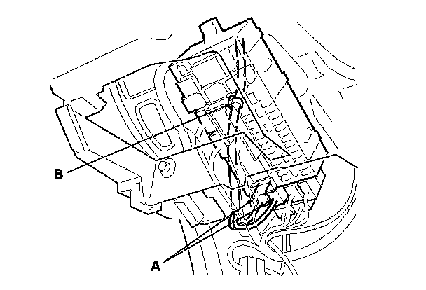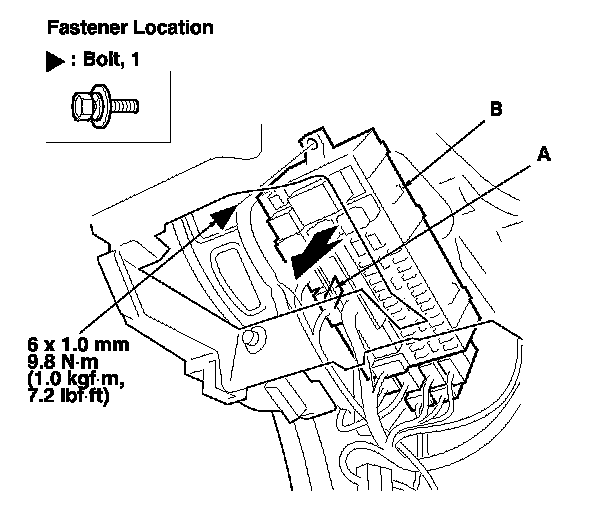 12. From under the driver's dash, remove the bolt, and release the hook (A), then move the driver's under-dash fuse/relay box (B).