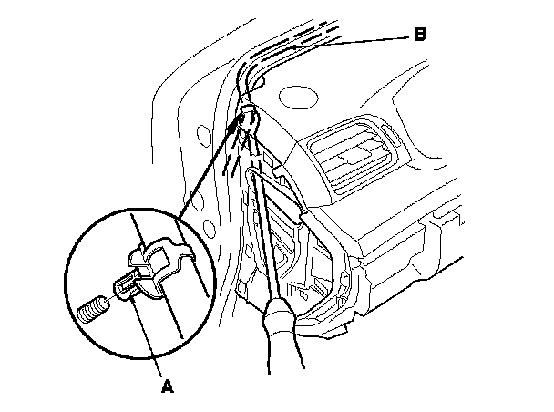 14. From outside of the driver's dash, carefully pry up the roof wire harness holder (A) with a long-handled clip remover from the stud-bolt, then pull out the roof wire harness (B) from inside the dashboard.