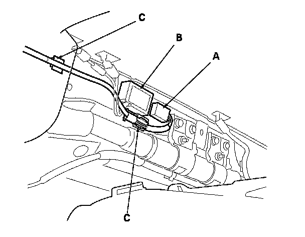 11. Remove the antenna lead (A) by detaching the harness clips (B) from the passenger's side A-pillar, and disconnect the antenna lead connector (C).