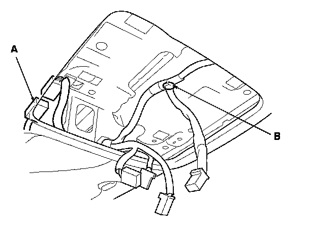 16. From the roof console opening, disconnect the moonroof subharness connector (A), and detach the harness clip (B).