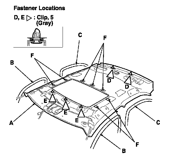 Detach the front clips (E) and the Velcro fasteners (F) by lowering the moonroof opening edge of the headliner.