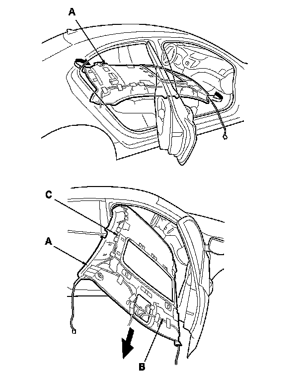19. If necessary, remove the roof wire harness (A) and the antenna lead (B) from the headliner (C).