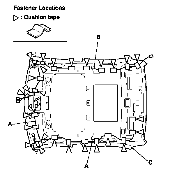 -5 Pull the headliner along with the roof wire harness (B) and the antenna lead (C) out through the passenger's front door.