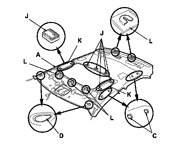 - Any fastener bases (J), stiffeners (K), or the clip bases (L) which have come off the headliner