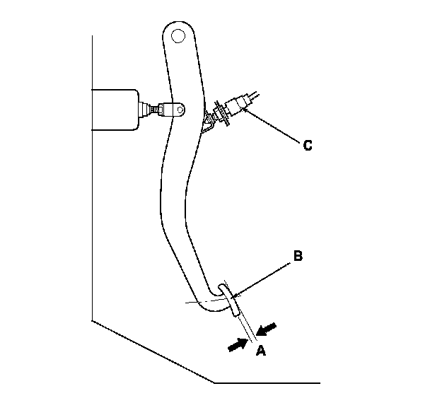 1. With the ignition switch in LOCK (0), inspect the free play (A) at the pedal pad (B) by pushing the brake pedal by hand. If the brake pedal free play is out of specification, adjust the brake pedal position switch (C). If the brake pedal free play is insufficient, it may result in brake drag.