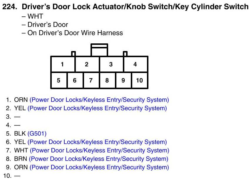 View 224 - Driver's Door Lock Actuator/Knob Switch/Key Cylinder Switch Connector View