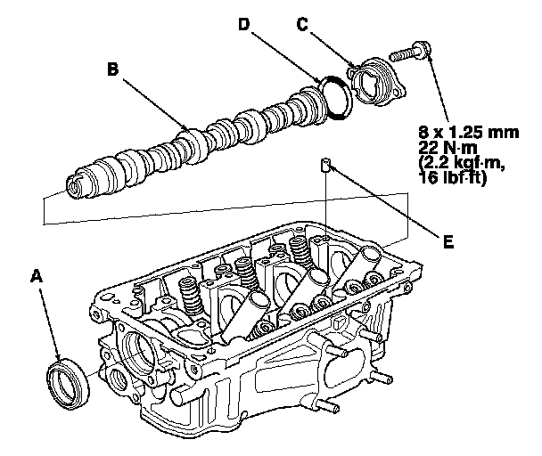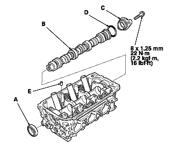 5. Insert the camshaft (B) into the cylinder head, then install the camshaft thrust cover (C). Always use a new O-ring (D). Apply new engine oil to the journals and the cam lobes.