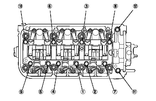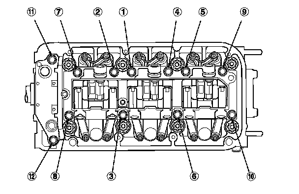 12. Tighten each bolt two turns at a time in the sequence shown to ensure that the rockers do not bind on the valves.