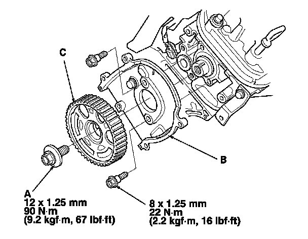 14. Apply new engine oil to the threads of the camshaft pulley mounting bolt (A). Install the back cover (B), then install the camshaft pulley (C).