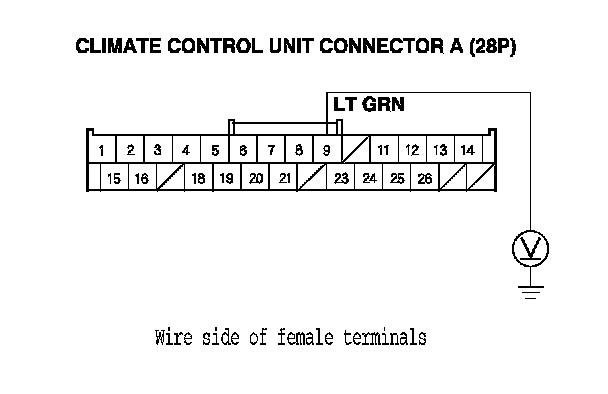 4. Measure the voltage between climate control unit connector A (28P) terminal No. 9 and body ground.