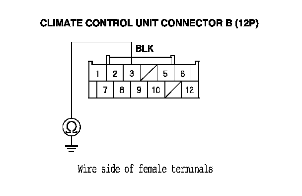 7. Check for continuity between climate control unit connector B (12P) terminal No. 3 and body ground.