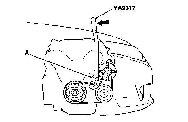2. Move the auto-tensioner (A) using the belt tension release tool in the direction shown to relieve tension from the drive belt, then remove the drive belt.