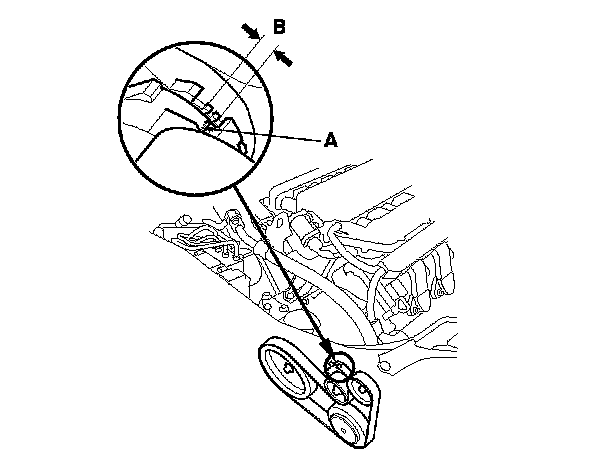 3. Check that the position of the auto-tensioner indicator (A) is within the standard range (B) as shown. If it is out of the standard range, replace the drive belt. Service and Repair