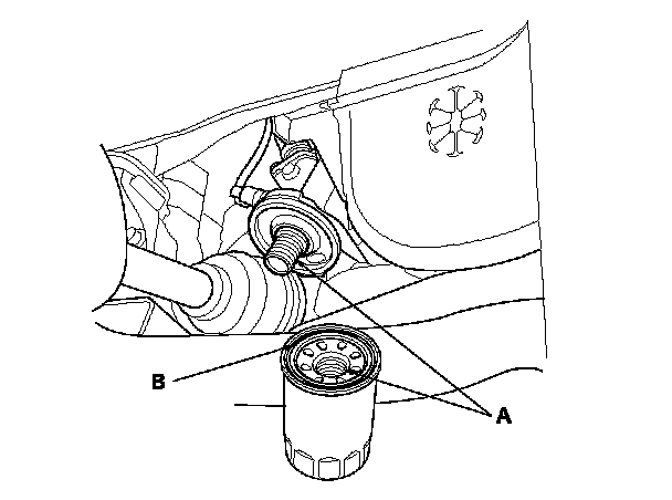 3. Inspect the threads (A) and the rubber seal (B) on the new filter. Clean the seat on the oil filter base, then apply a light coat of new engine oil to the filter rubber seal. Use only filters with a built-in bypass system.