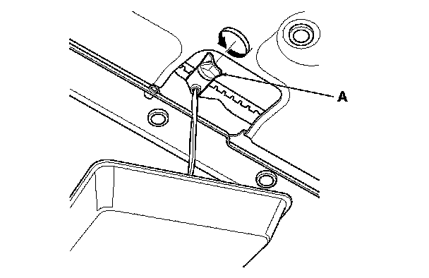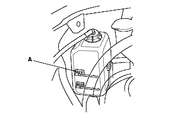 8. Fill the coolant reservoir to the MAX mark (A) with Acura Long Life Antifreeze/Coolant Type 2 (P/N OL999-9011A).