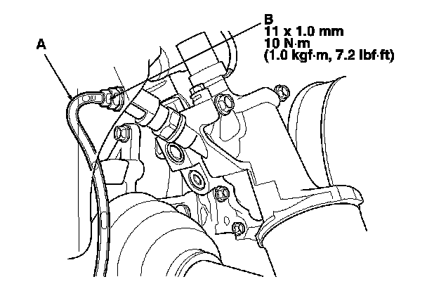 4. Install a rubber hose (A) on the drain bolt (B) located at the rear of the engine block, then loosen the drain bolt.