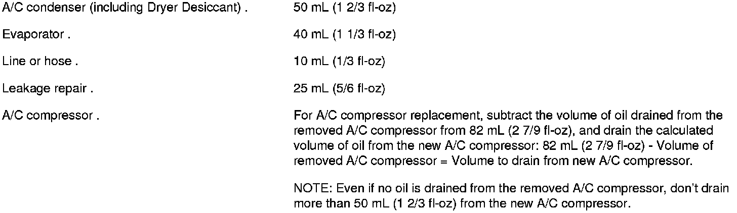 It is important to have the correct amount of refrigerant oil in the A/C system to ensure proper lubrication of the compressor. Too little oil damages the compressor; too much oil reduces the cooling capacity of the system, and can produce high vent temperatures.