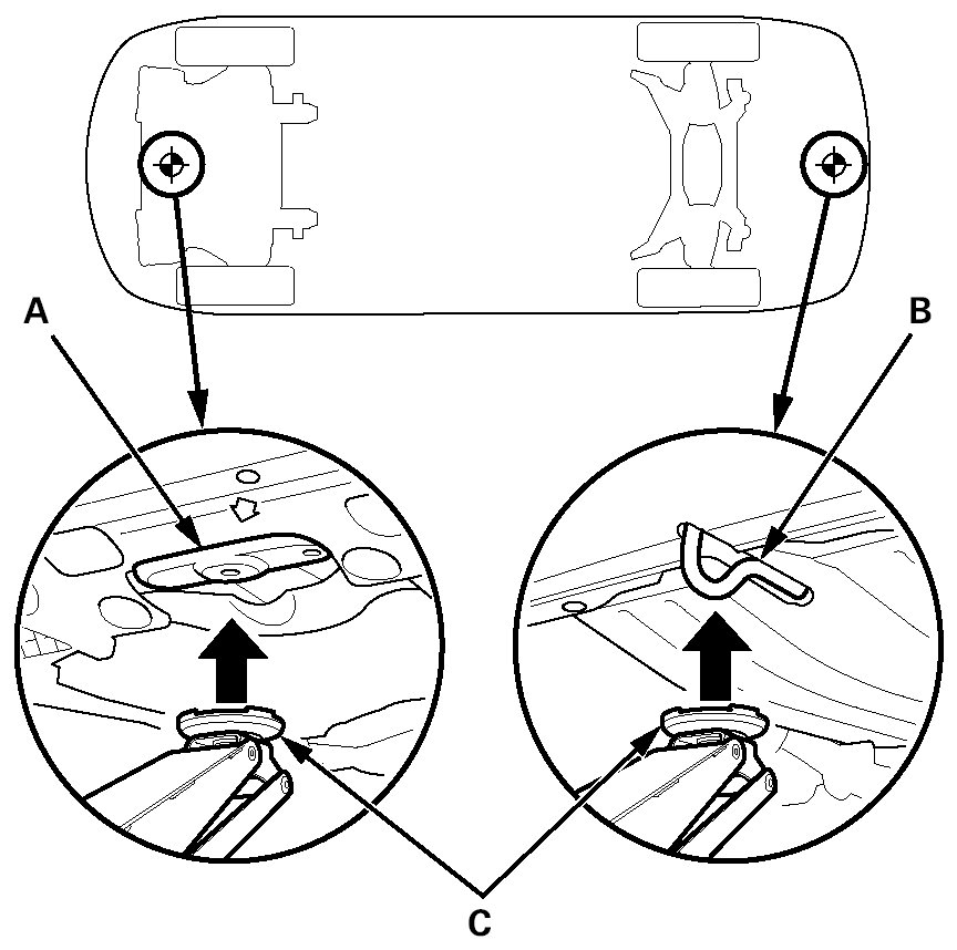 3. Position the floor jack under the front jacking bracket (A) or the rear jacking bracket (B). Center the jacking bracket on the jack lift platform (C), and jack up the vehicle high enough to fit the safety stands under it.