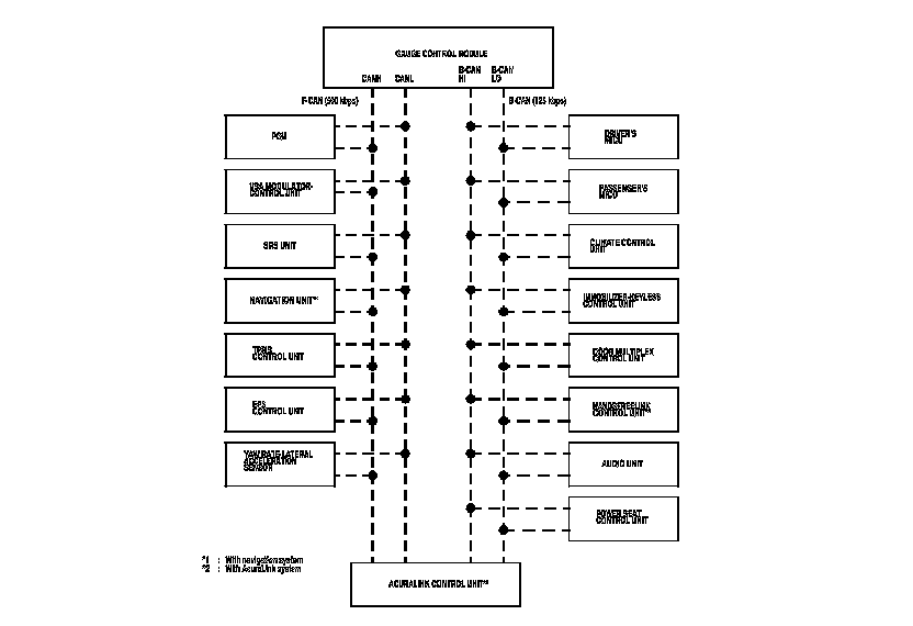 The gauge control module acts as a gateway to allow both systems to share information. The gauge control module translates and relays the information from B-CAN to F-CAN and from F-CAN to B-CAN.