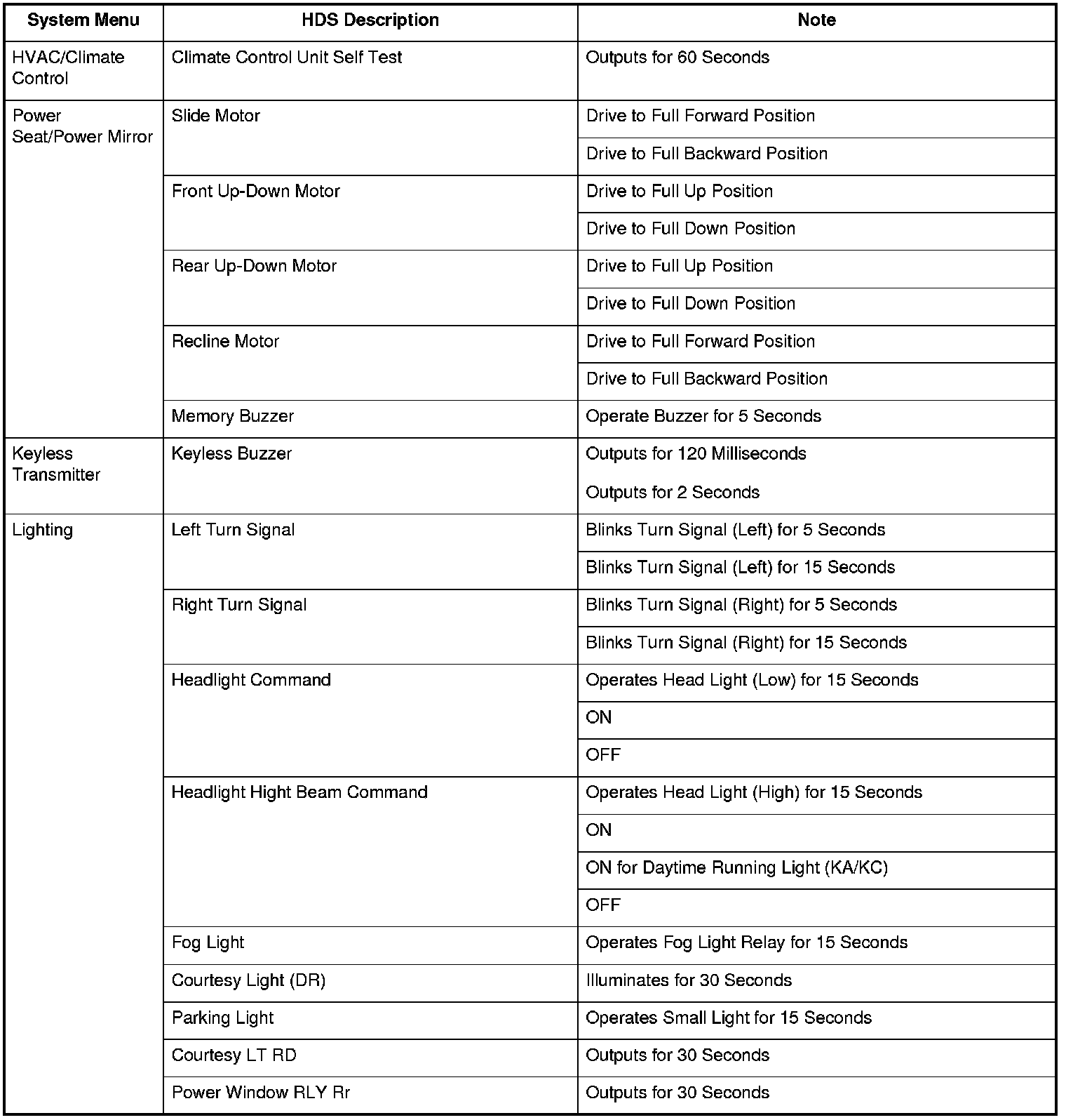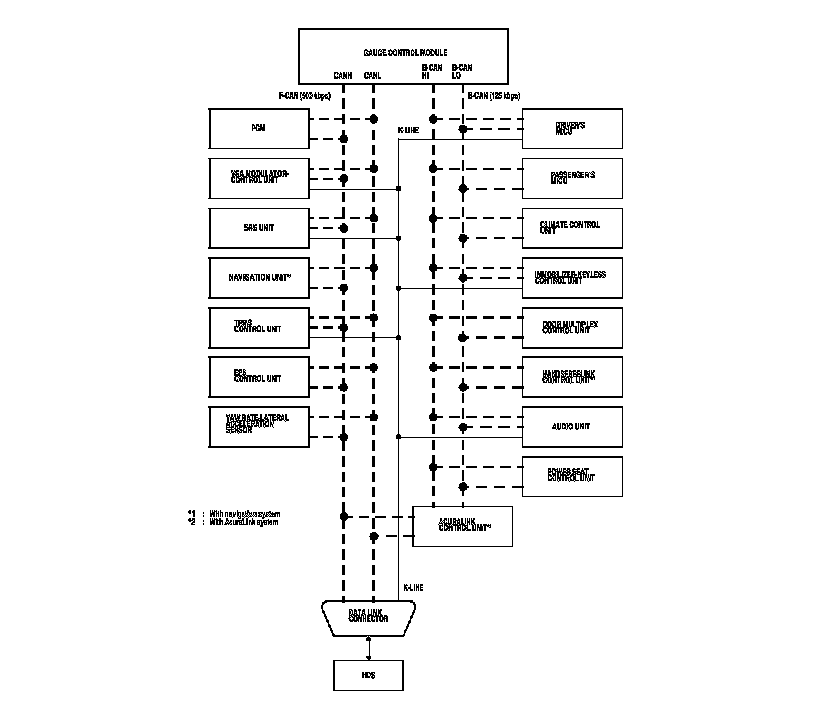 By connecting the HDS to the data link connector (DLC), the HDS can retrieve the diagnostic information from the driver's MICU via a diagnostic line called the K-LINE. The K-LINE is a separate communication line from the CAN lines, but it is connected to most of the CAN related ECUs. The driver's MICU is a gateway between the HDS and B-CAN related ECUs, and sends B-CAN diagnostic information to the HDS. When doing a function test with the HDS, the HDS sends an output signal through the K-LINE to the driver's MICU. The driver's MICU either relays the request to another ECU, or commands the function itself.