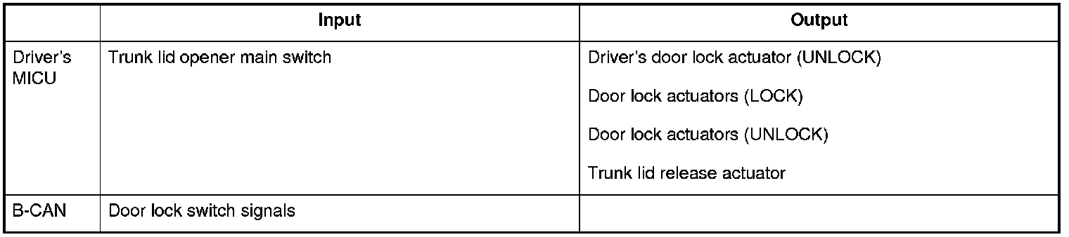 The driver's MICU control of the door lock actuators LOCK, UNLOCK, DRIVER'S UNLOCK, TRUNK UNLOCK is based on B-CAN door lock switch signals.