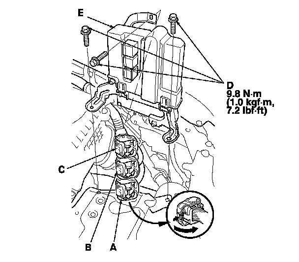 14. Disconnect PCM connectors A, B, and C, then remove the PCM assembly (E).