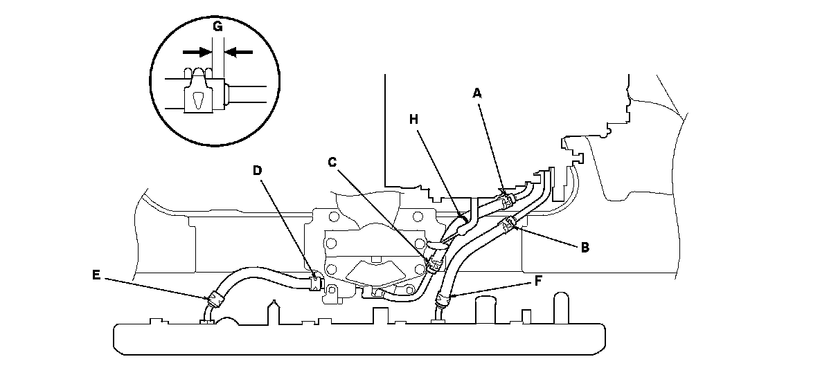 NOTE: Be sure to install the ATF cooler hose with the green paint line (H) as shown.