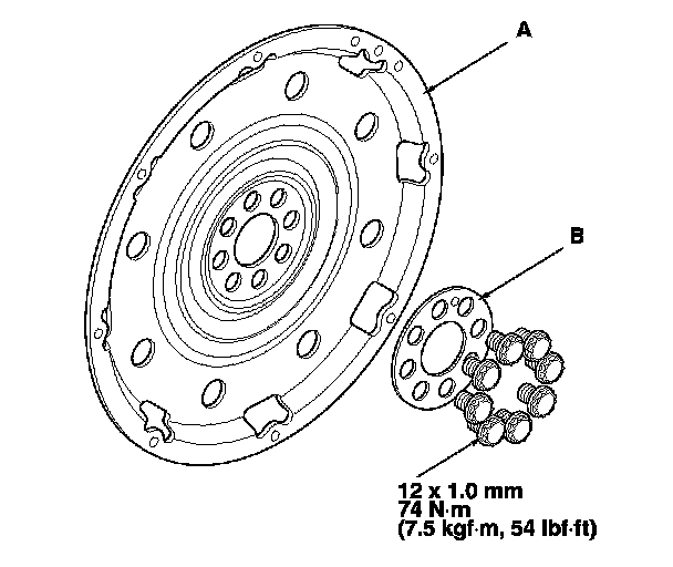 2. Remove the drive plate (A) and the washer (B) from the engine crankshaft.