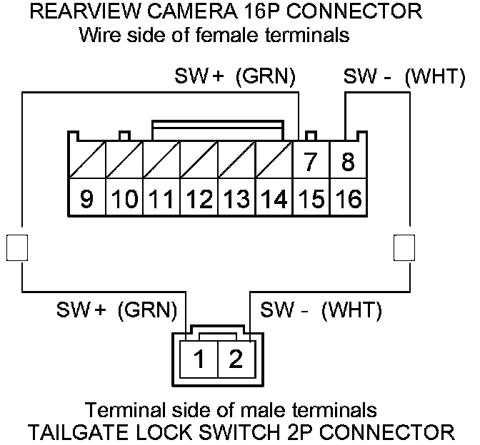 7. Check for continuity between rearview camera 16P connector terminals No. 7 and No. 8 , and tailgate lock switch 2P connector terminal No. 1 and No. 2.