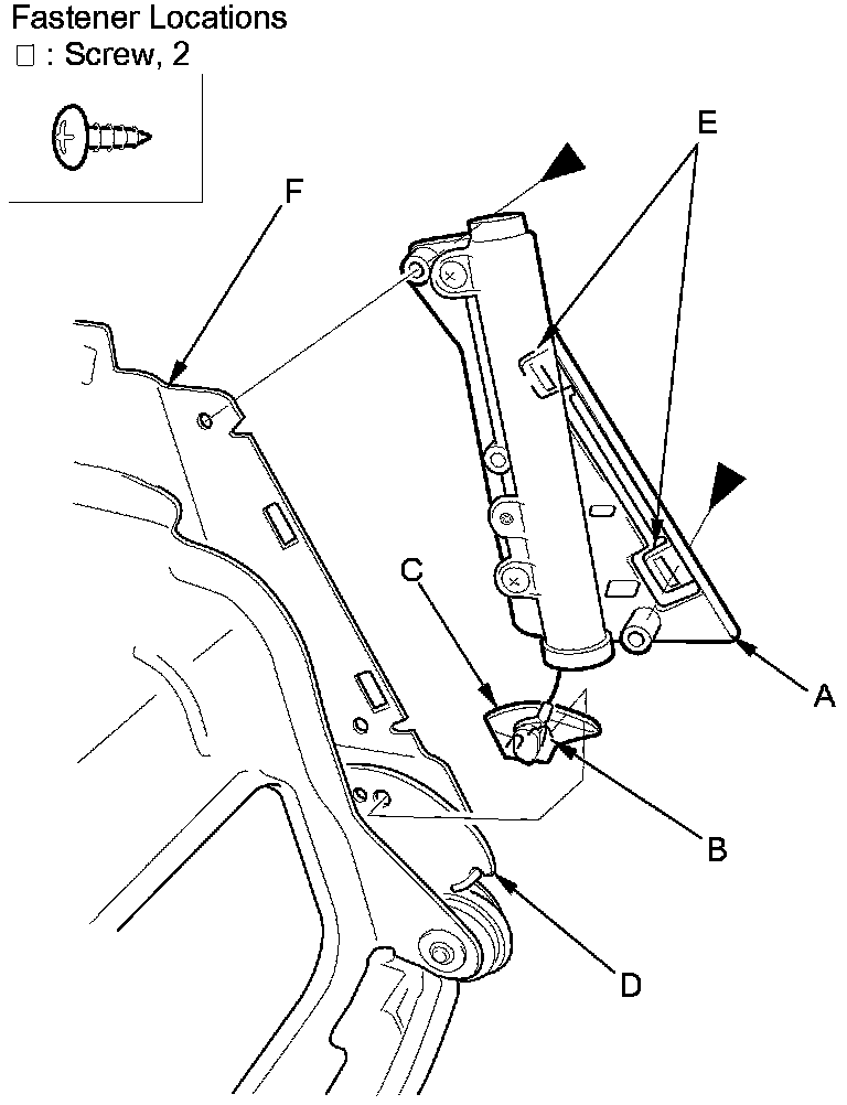 2. Remove the screws, then release the hooks (E) and remove the damper from the console frame (F).