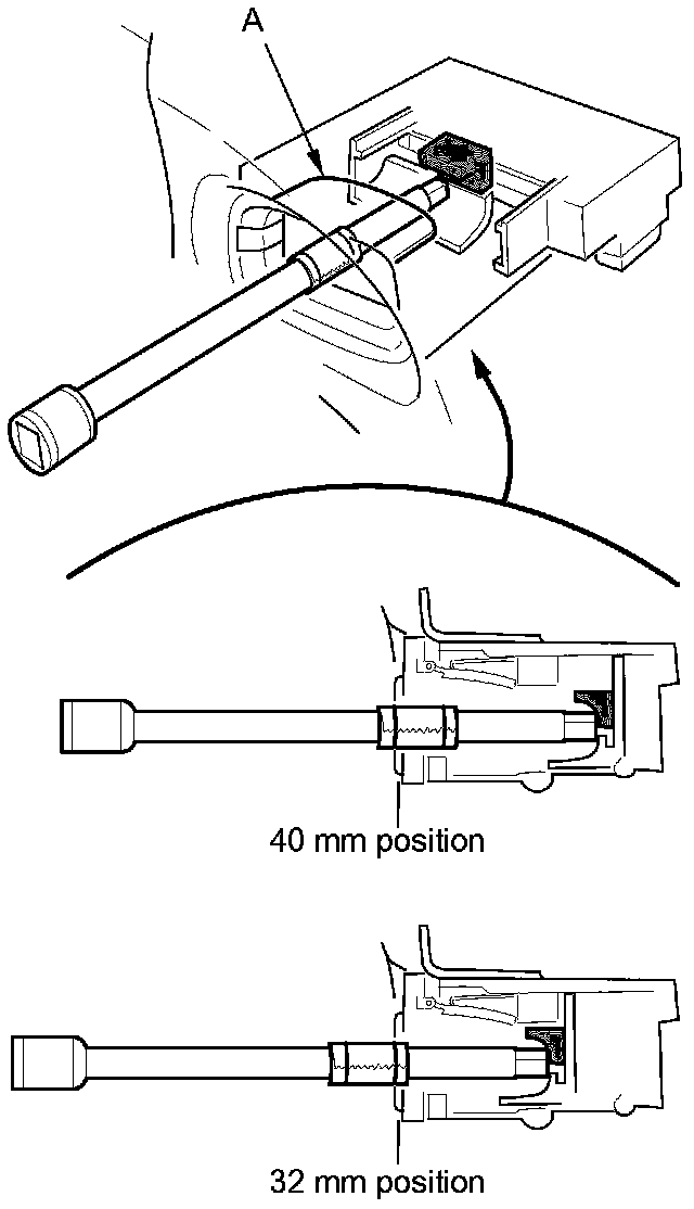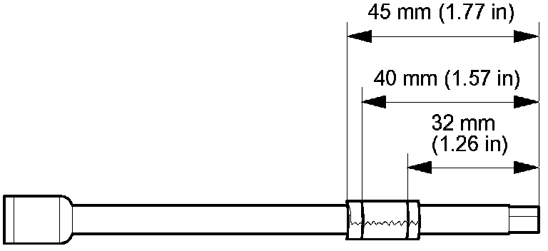 4. Create a measuring gauge by placing a piece of masking tape about 45 mm (1.77 in) from the tip of 6 inch long 1/4 inch drive extension. Make two lines on tape; one at 32 mm (1.26 in) and one at 40 mm (1.57 in).