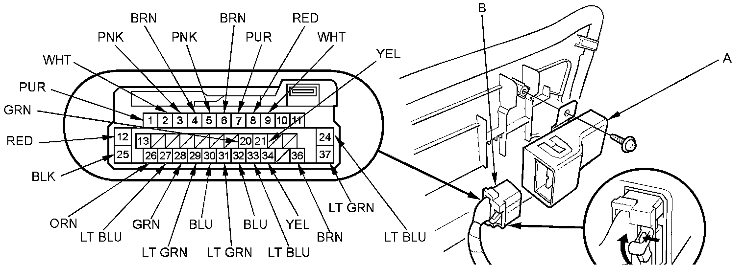 2. Disconnect the 37P connector (A) from the seat ventilation control unit (B).