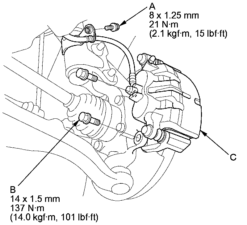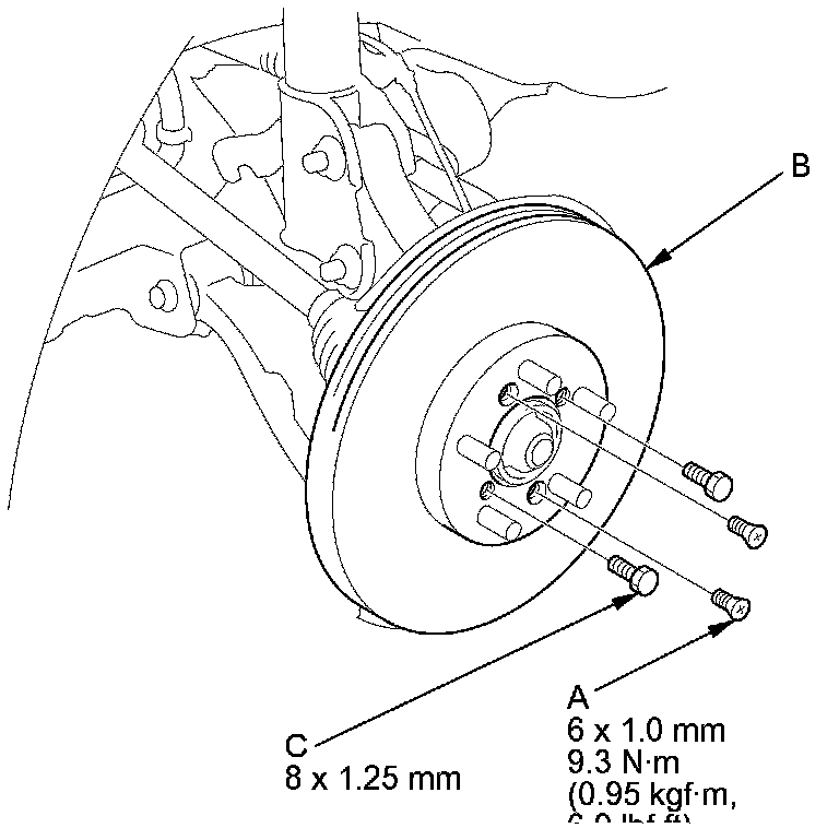 NOTE: If the brake disc is stuck to the hub bearing unit, thread two 8 x 1.25 mm bolts (C) into the brake disc to push it away from the hub bearing unit. Turn each bolt 90 degrees to prevent the brake disc from binding.