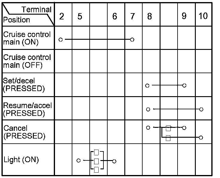 - If there is continuity, and it matches the table, but the cruise control combination switch failure occurred on the cruise control input test, check and repair the wire harness on the switch circuit.