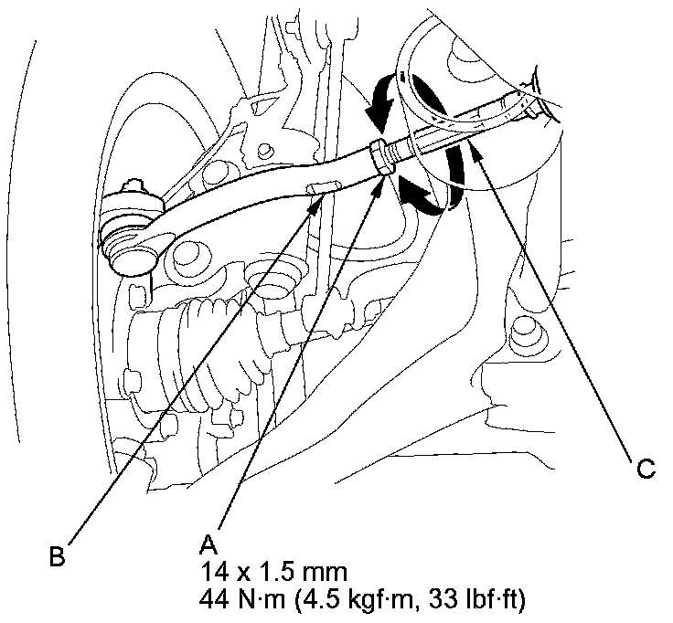 3. Loosen the tie-rod locknuts (A) while holding the flat surface sections (B) of the tie-rod end with a wrench, and turn both tie-rods (C) until the front toe is within specifications.