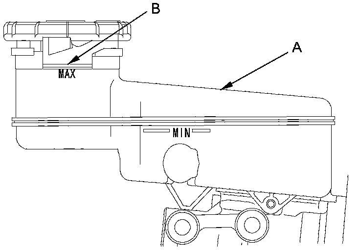 1. Make sure the brake fluid level in the reservoir (A) is at the MAX (upper) level line (B).
