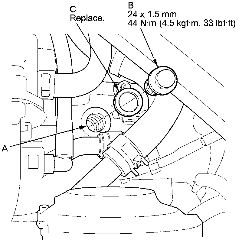11. Install the ATF filler bolt (B) and a new sealing washer (C).