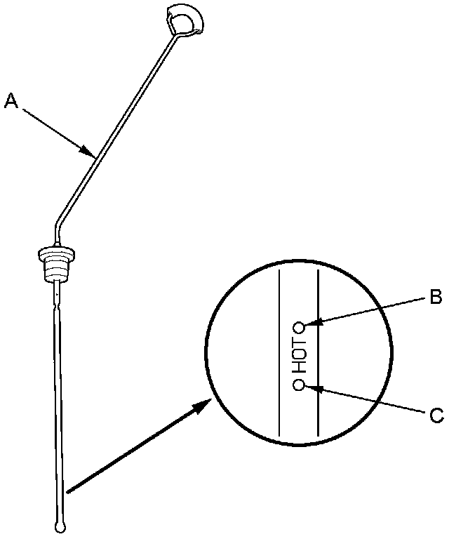 13. Make sure the fluid level is between the upper mark (B) and the lower mark (C) on the dipstick, then insert the dipstick back into the dipstick guide tube.