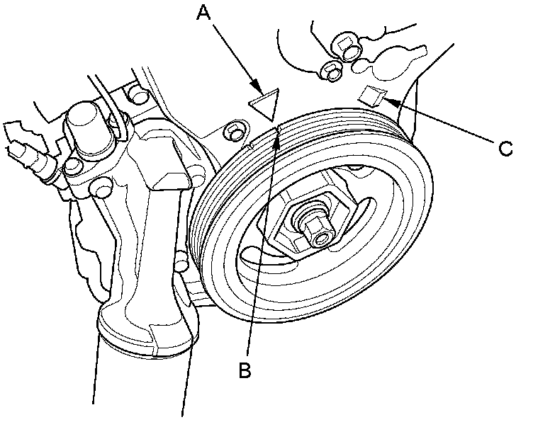 9. Aim the light toward the pointer (A) on the timing belt lower cover. Check the ignition timing under a no load condition (headlights, blower fan, rear window defogger, and air conditioner are turned off).