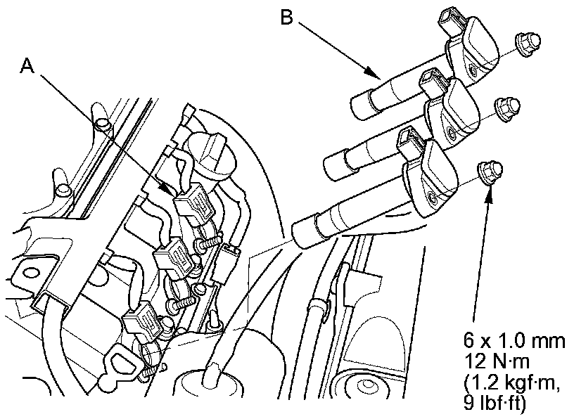 2. Disconnect the ignition coil connectors (A), then remove the front ignition coils (B).
