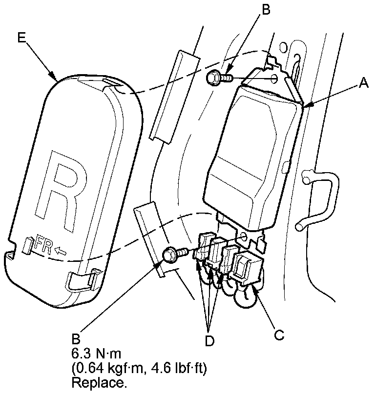 1. Place the ODS unit (A) on the seat-back frame. Tighten the two bolts (B), and connect the ODS unit 18P connector (C) and OPDS sensor connectors (D) to the ODS unit. Reinstall the cover (E).