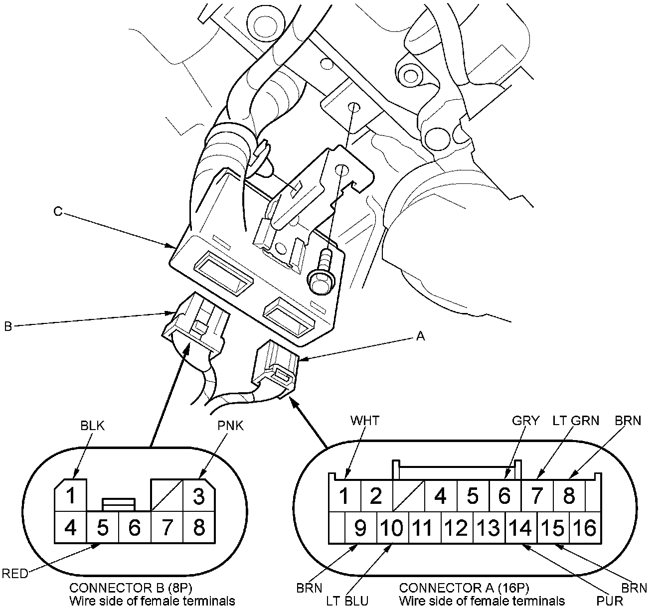 3. Disconnect the 16P connector (A) and 8P connector (B) from the power title/telescopic steering control unit (C).