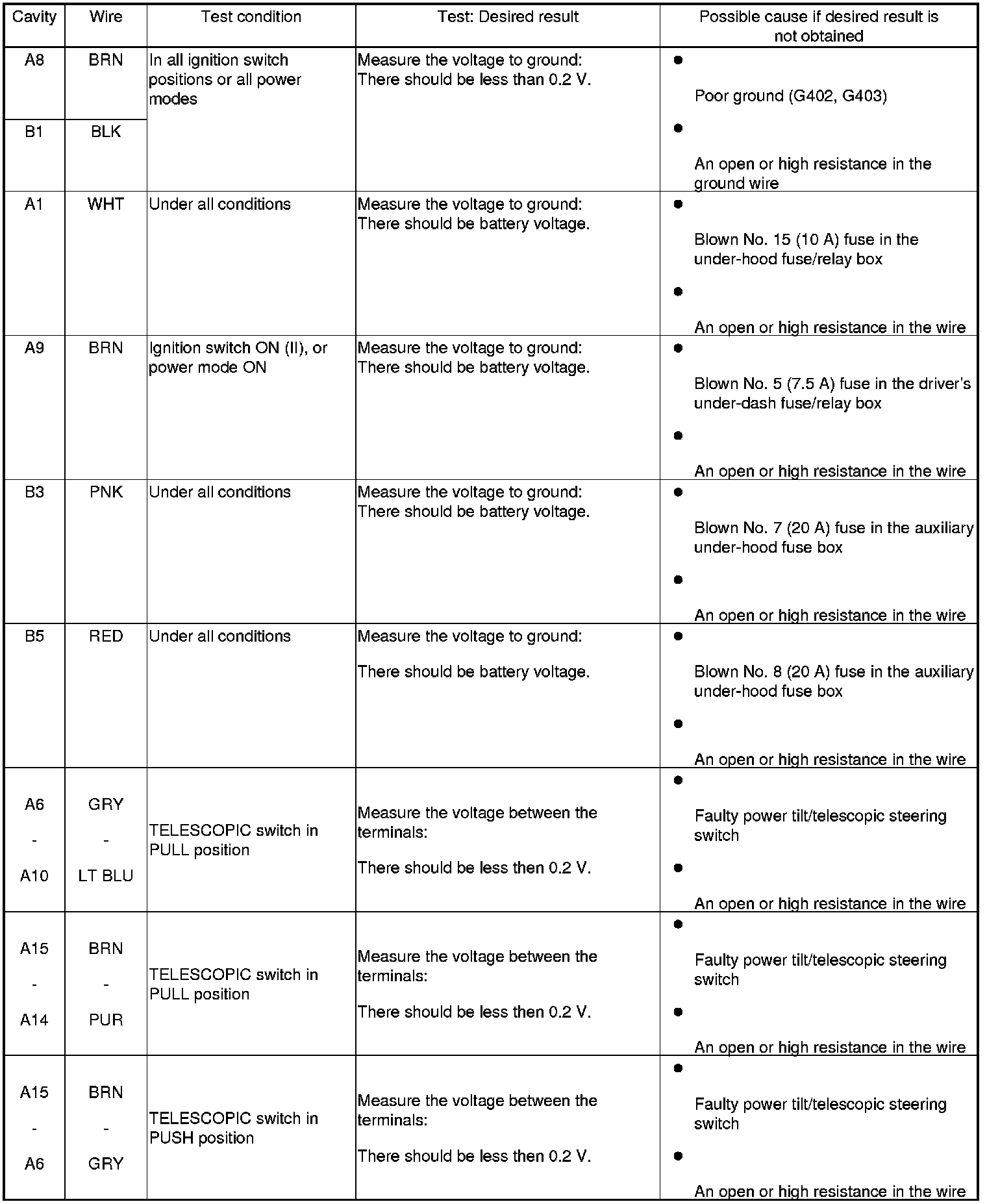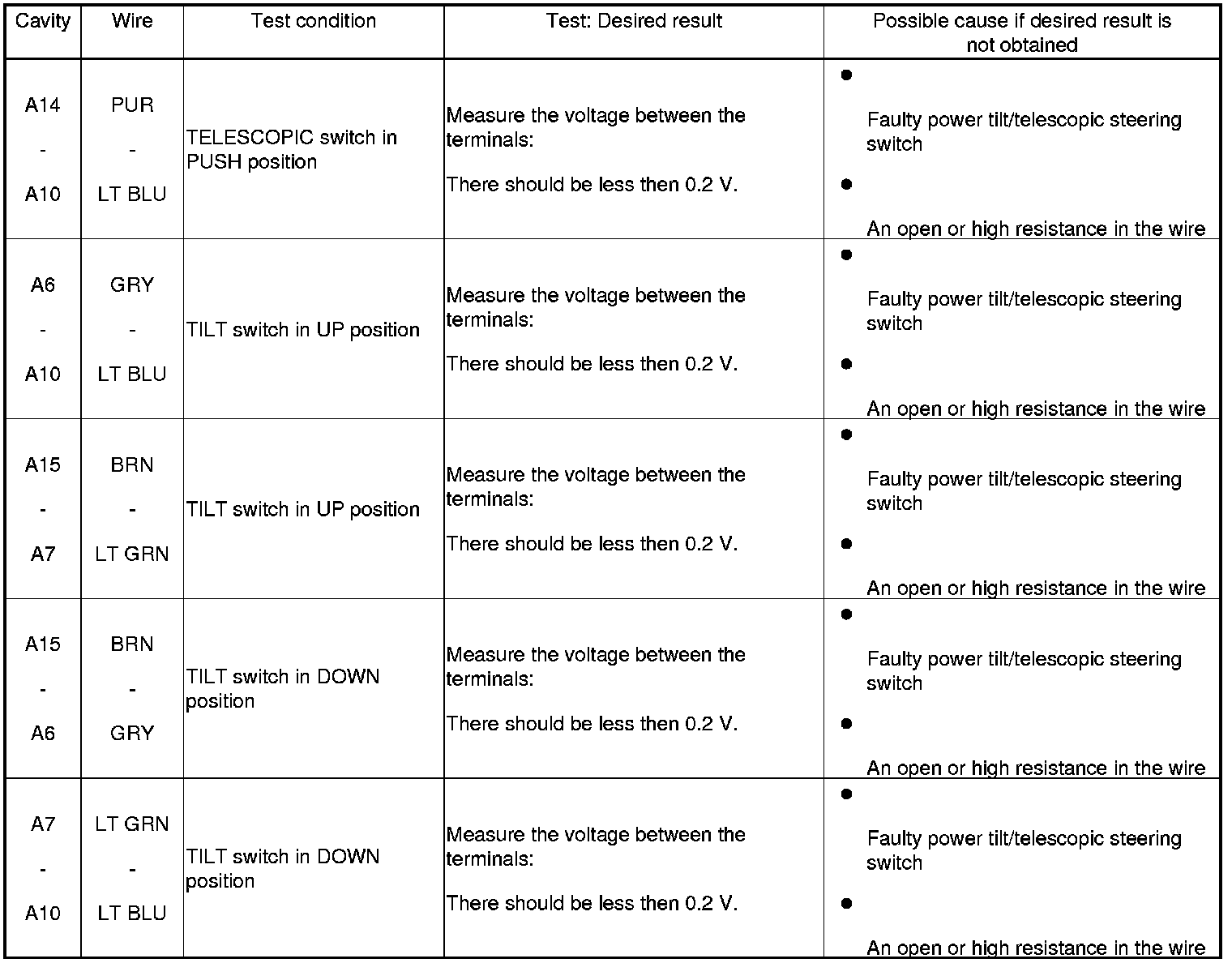 5. Reconnect the connector to the power tilt/telescopic steering control unit, and do the following input tests:
