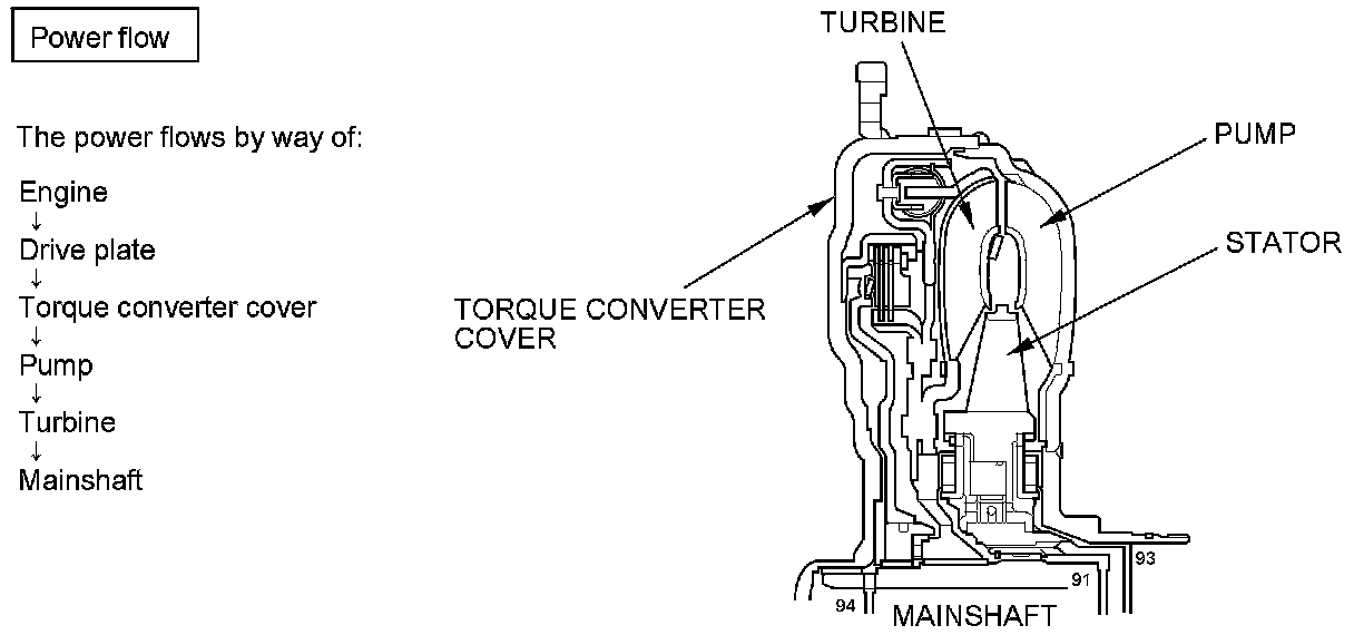 The fluid pressure is applied to the lock-up fluid passage (94) in the torque converter, causing the lock-up clutch in the torque converter to be engaged and then the turbine and the torque converter cover to be engaged. The mainshaft rotates at the same speed as the engine crankshaft when the lock-up clutch in the torque converter is engaged.