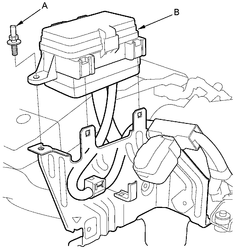 11. Remove the stud bolt (A), then swing the auxiliary under-hood fuse/relay box (B) out of the way.