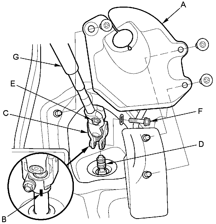 15. Make reference marks (B) across the steering joint (C) and the steering gearbox pinion shaft (D). If the center guide is still installed, take care not to displace it. If the center guide is no longer installed, or is displaced during when the joint is disconnected, refer to the reference marks to reinstall the joint. Loosen the upper steering joint bolt (E), and remove the lower steering joint bolt (F), then disconnect the steering joint from the steering gearbox pinion shaft. Do not disconnect the steering joint from the column shaft (G).