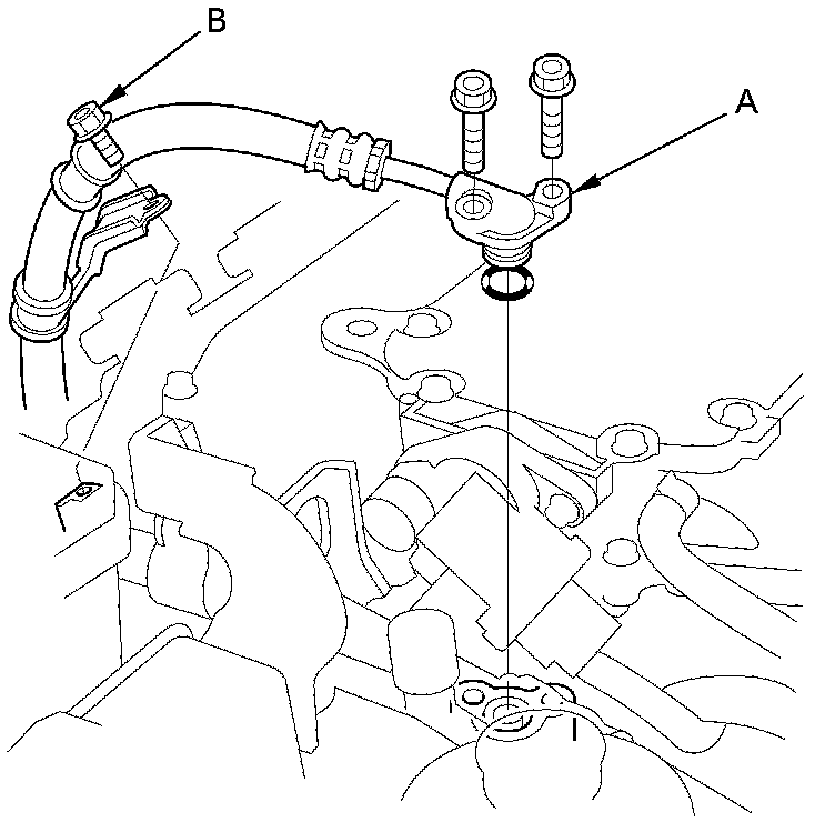 16. Cover the auto-tensioner, the alternator, the A/C compressor with several shop towels to protect them from spilled power steering (P/S) fluid. Remove the P/S pump outlet line (A) from the P/S pump, and remove the hose clamp bolt (B). Cover the opening of the pump and the pump outlet line with a piece of tape to prevent foreign material from entering either the pump or the outlet line. Take care not to spill fluid on the vehicle. Wipe off any spilled fluid at once.