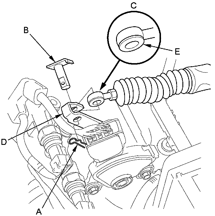 24. Check the bushing (E) in the shift cable end for proper fit and wear. If the bushing is loose or worn, replace the shift cable Service and Repair.
