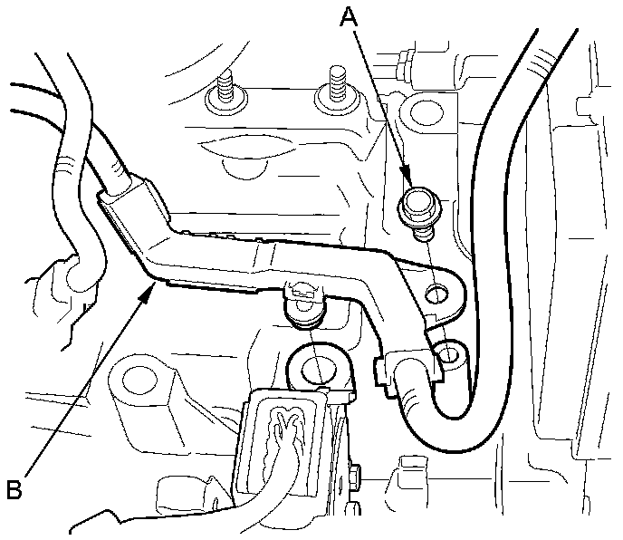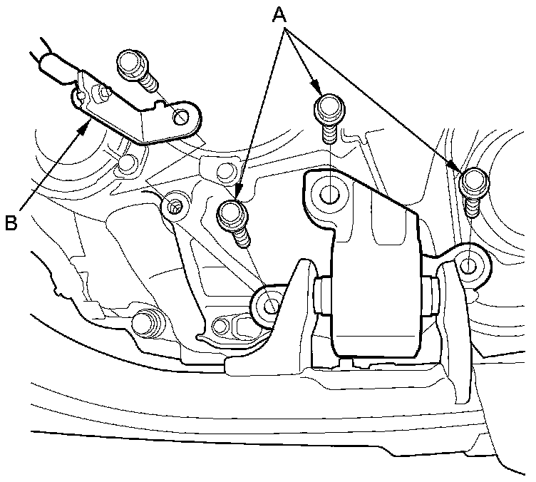 64. Remove the transmission lower mount bolts (A) and the transmission ground terminal bracket (B).